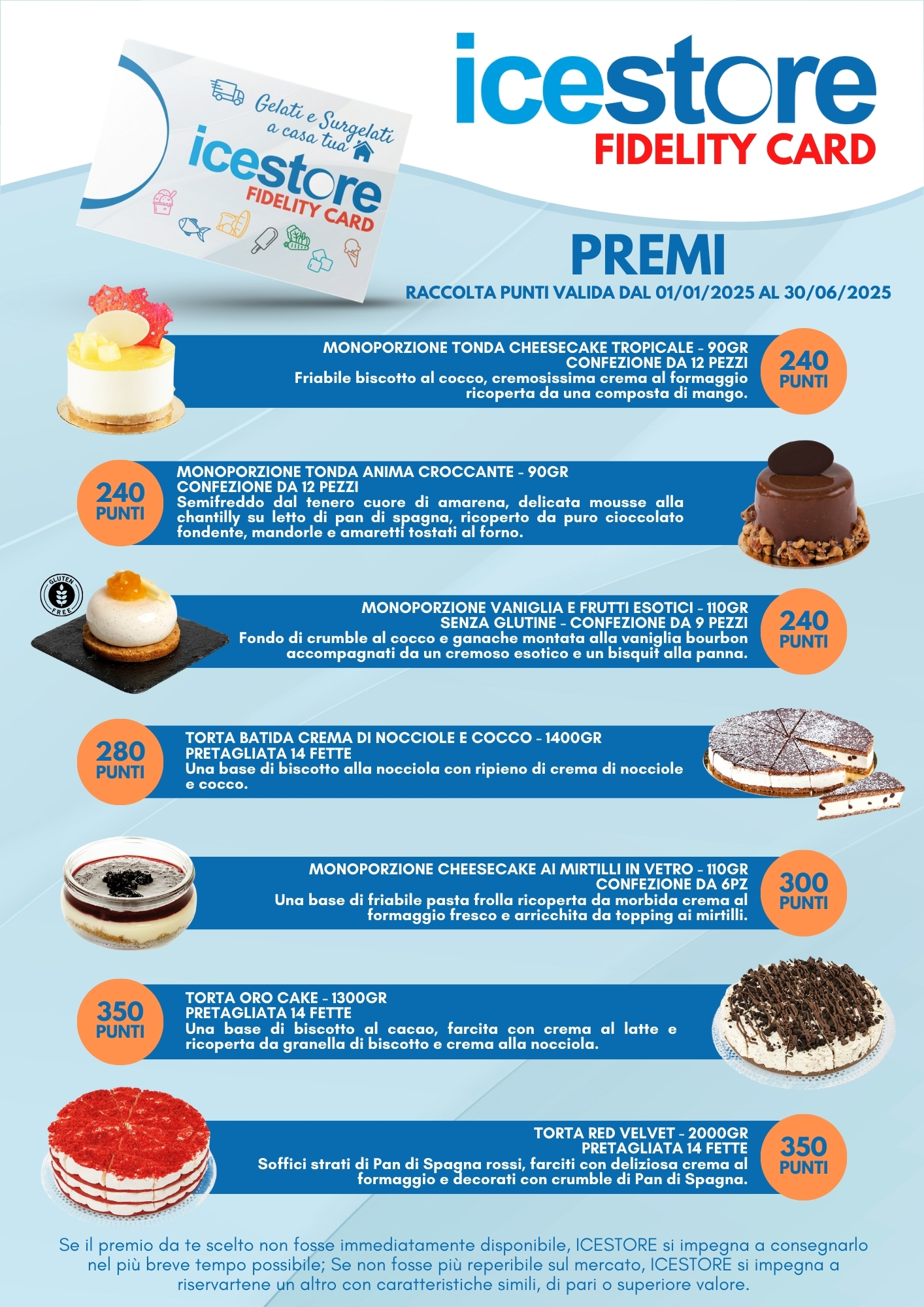 Potrai beneficiare della raccolta punti e ricevere in anteprima le nostre promozioni. Ogni euro speso da IceStore vale 1 punto sulla tua Fidelity Card. Scopri i premi e il loro rispettivo punteggio per ottenerli.